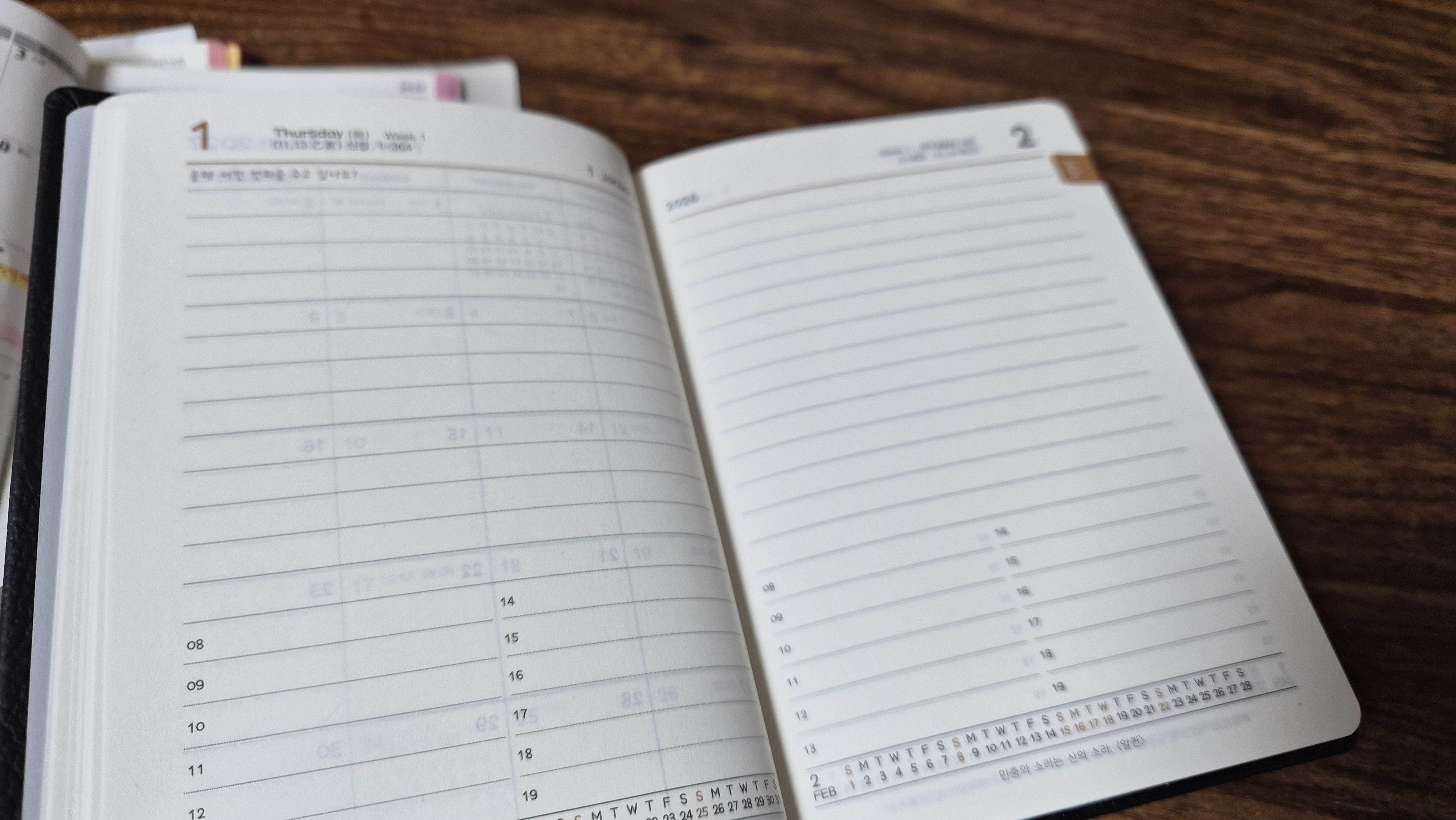 우선 가죽느낌의 매트한 커버가 너무 마음에 들었어요. 12월 캘린더가 있어 다음주부터 쓸수 있다는 점도 좋았구요. 일간페이지는 1월 1일부터 있어서 내년이 기다려져요. 양지다이어리 최고입니다~~