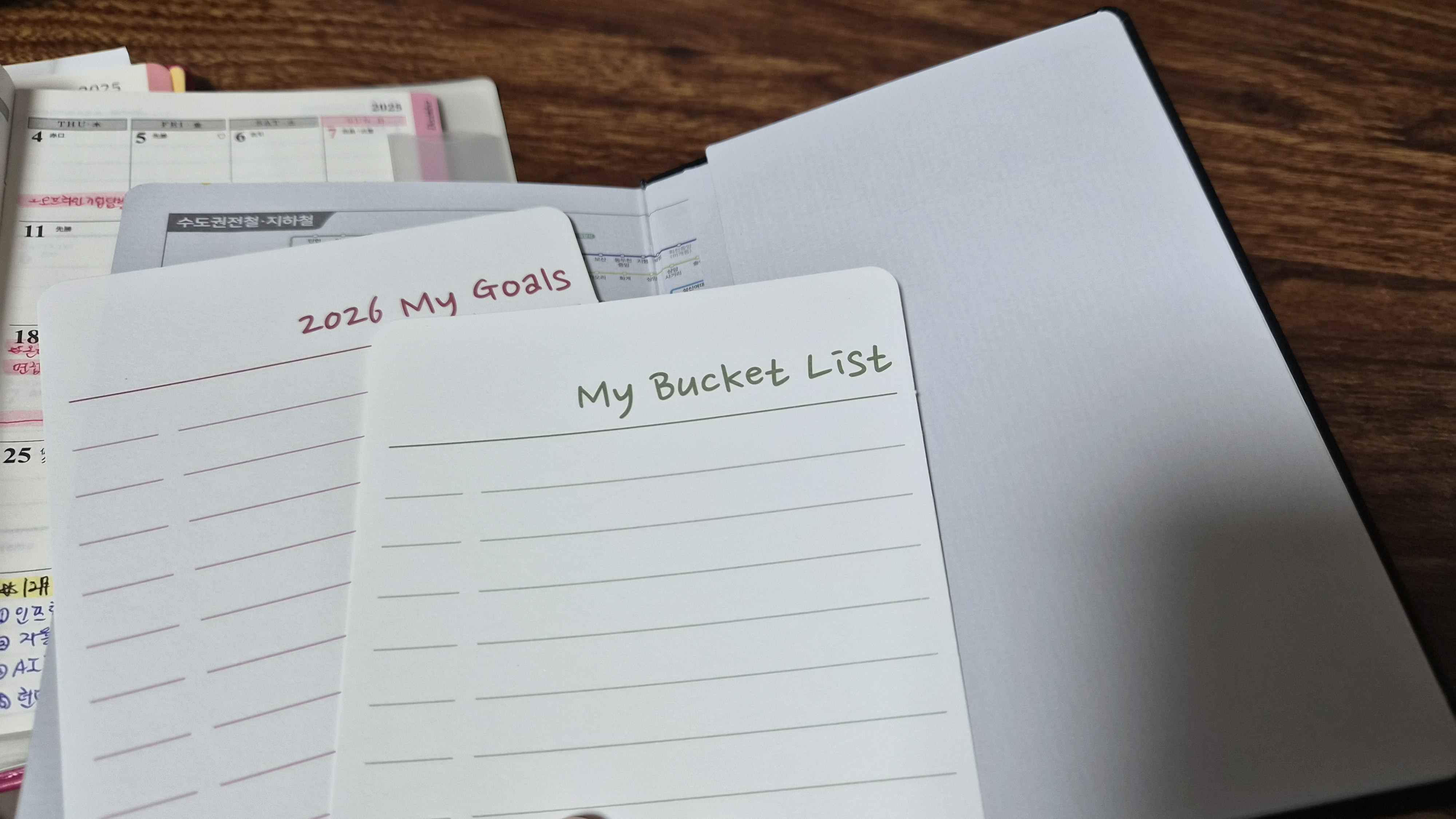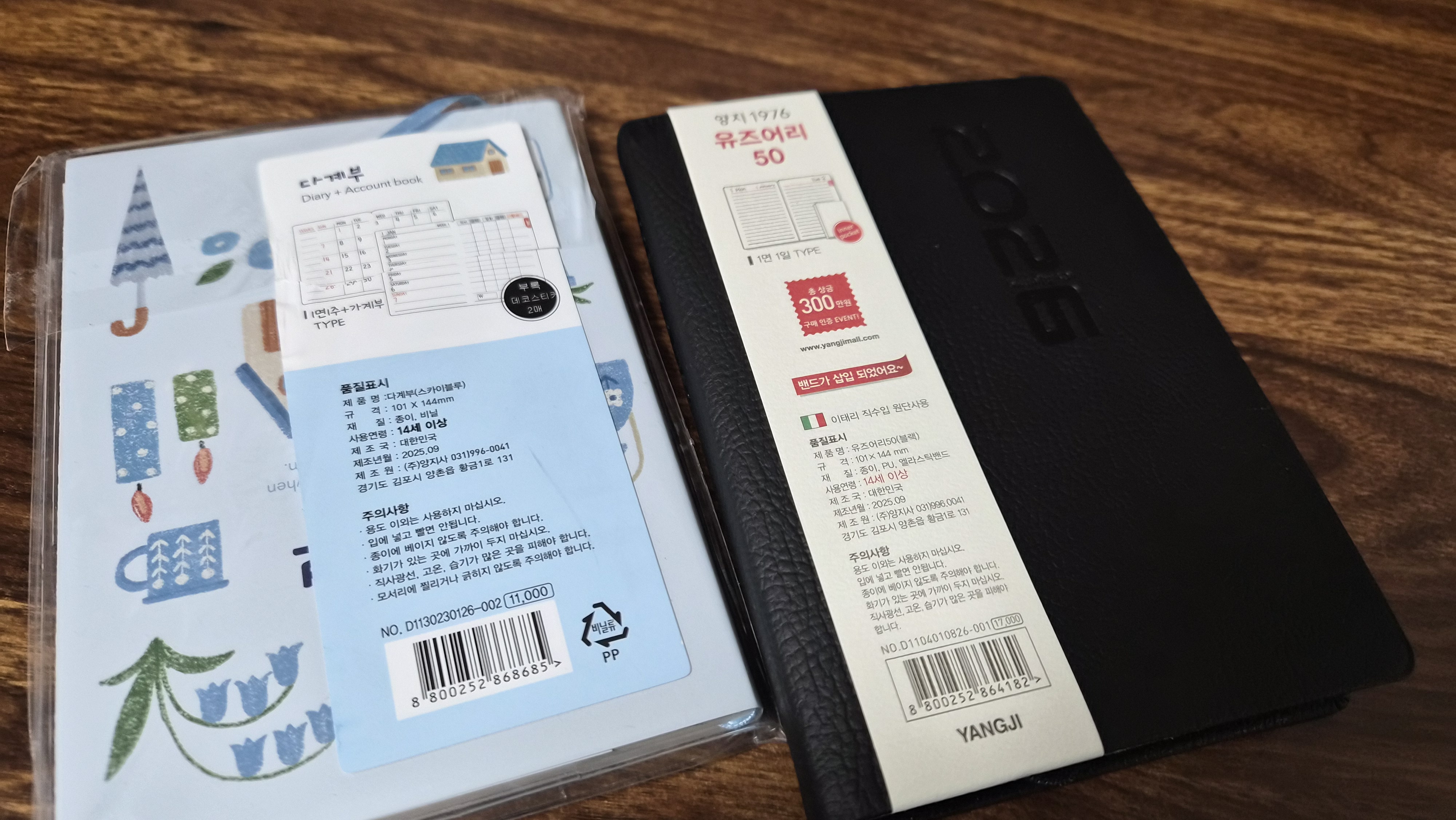 2022년도부터 양지다이어리를 사용하여 꾸준히 메모하고 기록하는 습관을 만들어왔습니다. 작년에는 레이디스48을 사용했는데, 올해 유즈어리50이 리뉴얼되어 출시됐다는 말을 들어서, 새로 나온 다계부와 함께 구매했습니다! 제가 구매한 색은 블랙으로, 한 손에 쏙 들어오는 몰스킨 포켓과 유사한 사이즈입니다.