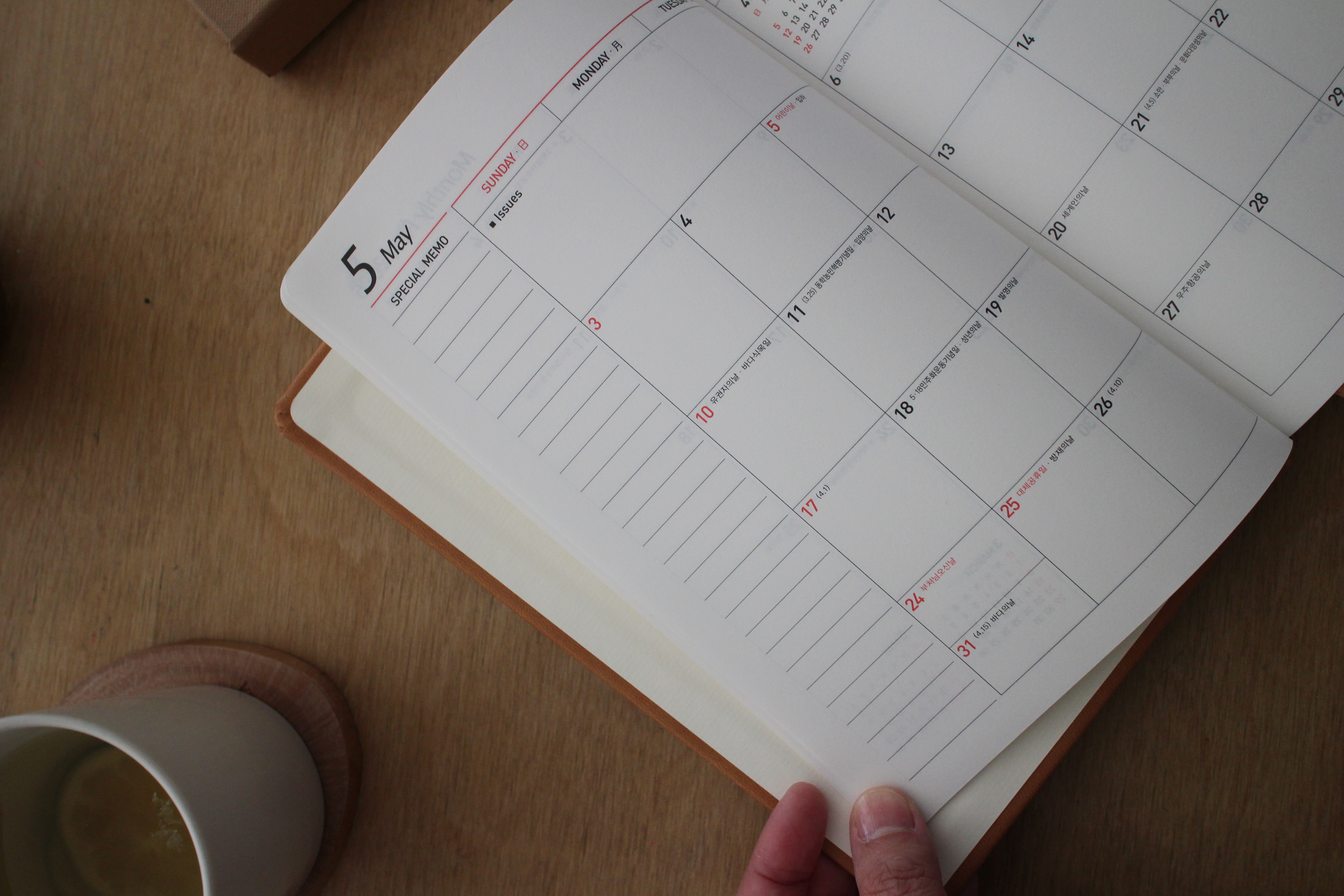 커버 컬러는 홈페이지 표기상 ‘탄(Tan)’인데, 실제로 보면 좀 더 따뜻한 카라멜 컬러에 가까워요. 너무 밝지도, 너무 어둡지도 않은 브라운톤이라 어떤 가방에 넣어도 잘 어울리고 질리지 않을 색감입니다. 수입 PU 원단이라 촉감도 부드럽고 내구성도 좋아 보여요. 밴드가 있는 커버 스타일이라 가방 속에서 펼쳐지거나 속지가 구겨질 걱정도 없어 실사용에 정말 적합해요.
