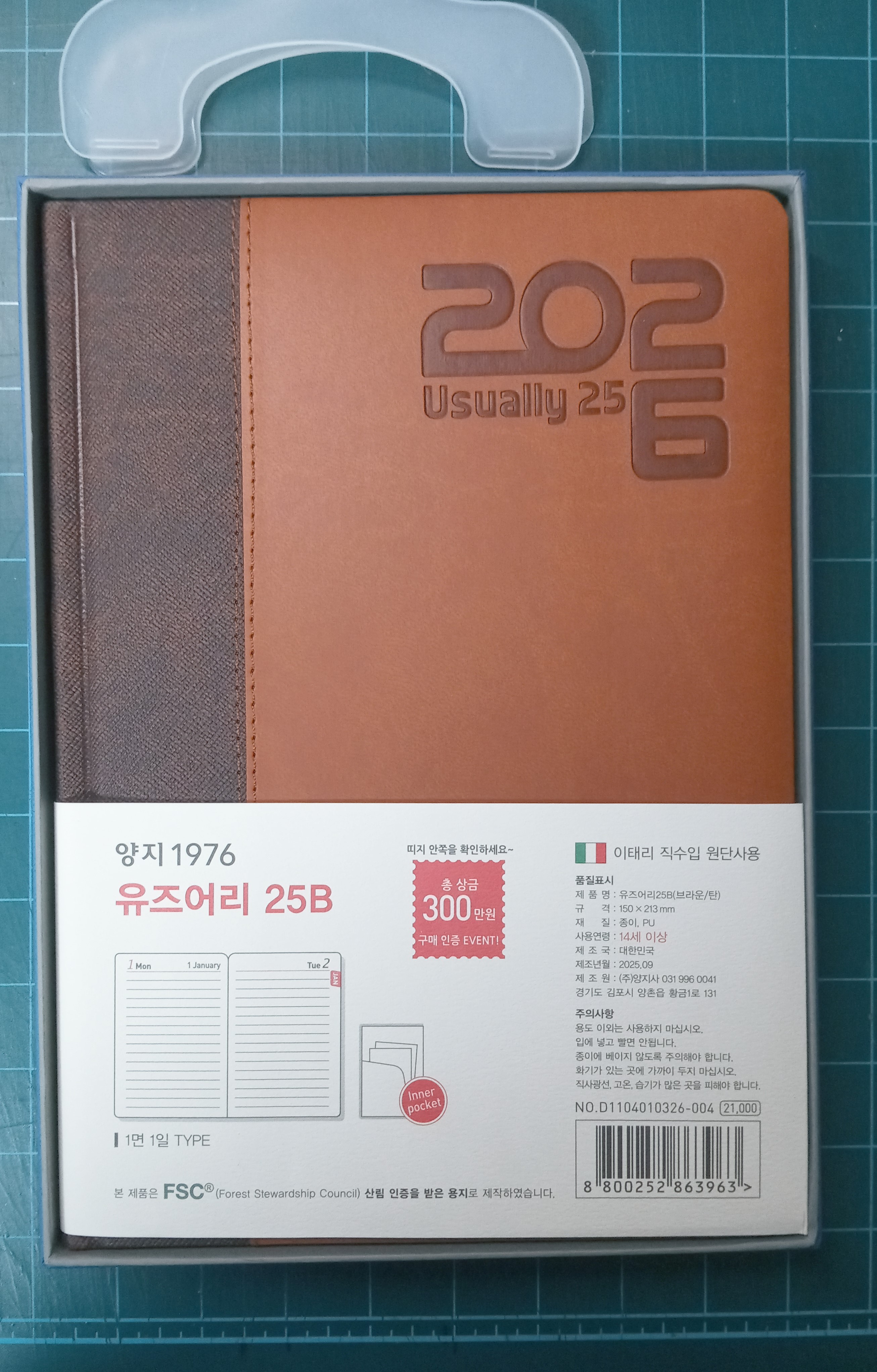올해는 유즈어리25A와 함께 하였습니다. 내년은 유즈어리25B와 함께 합니다. 할일 체크는 물론이고 생활 전반에 대한 기록도 남기기 위해 넓은 지면이 필요했고, 차분한 갈색을 선택했습니다. https://blog.naver.com/didorit70/224117516899