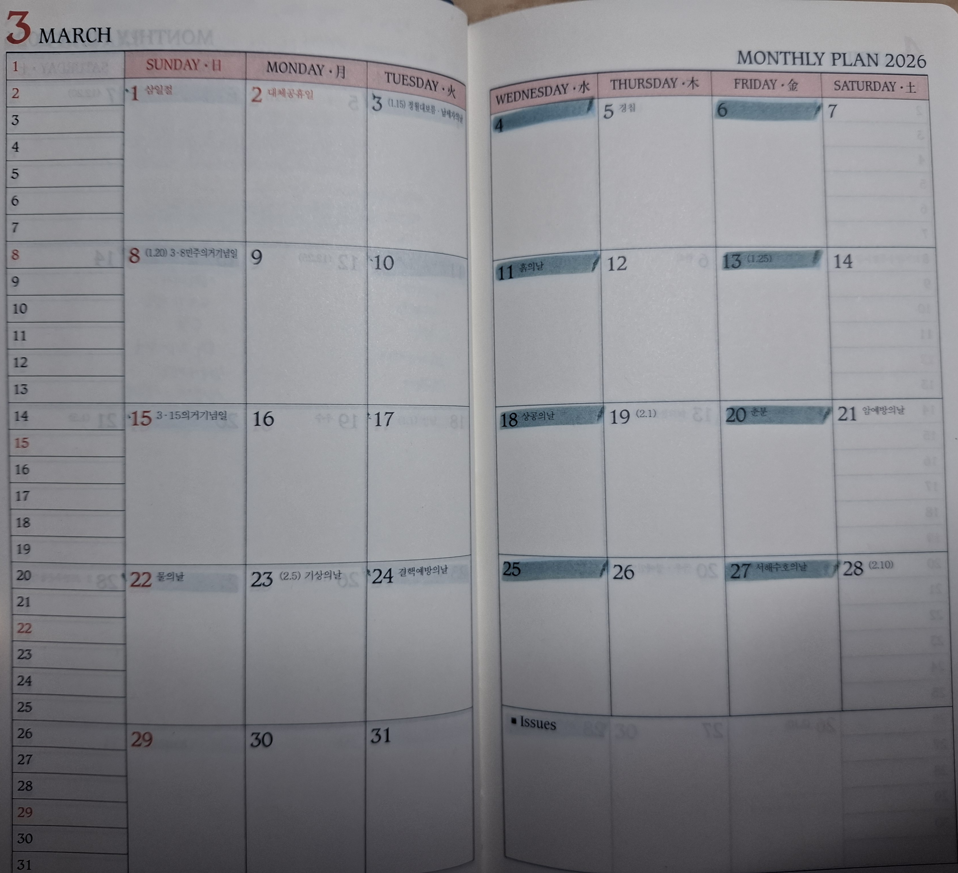 앞부분에 달력이 배치되어 있고, 좌측에 작게 활용 가능한 칸도 있습니다. 먼슬리가 지나면, 1일 1페이지로 구성되어 있습니다. 우측 상단에 달력을 작게 배치한 부분도 다이어리의 활용할 때 유용할 것 같습니다. 또 매달의 첫 시작 부분에 일자별로 things to do가 배치되어 매달 첫 시작을 계획할 때 혹은 매달이 끝나는 지점에서 회고할 때 잘 활용할 수 있을 것 같습니다. 뒷부분에 전화기록부가 있는데, 이번에는 이를 '독서기록'을 짧게 해보는 형태로 변형해서 사용할 계획입니다.