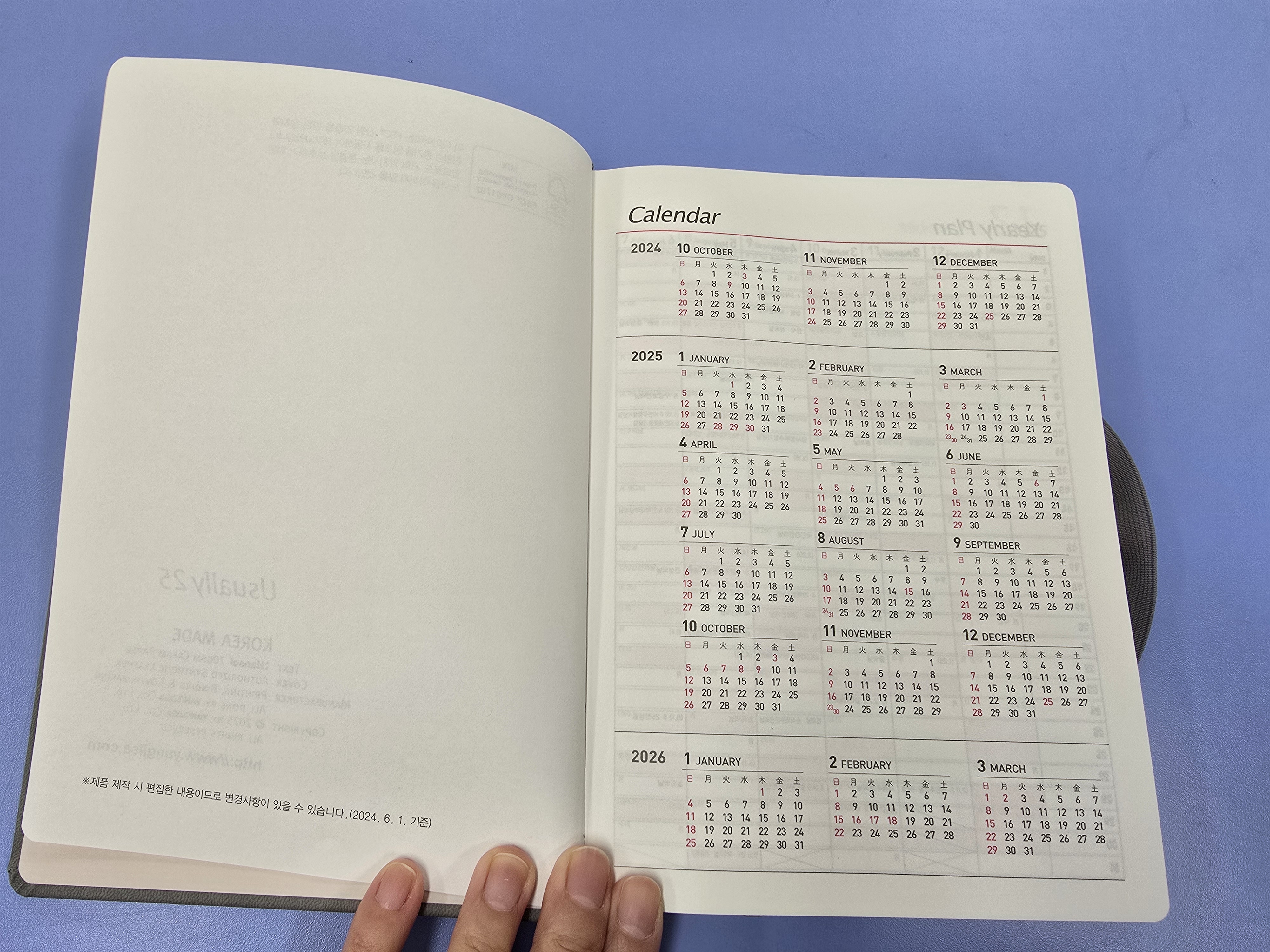 2025년 오프라인에서 다이어리 구매했는데 맘에듭니다. 일단 깔끔하고 얇아서 들고다니기 좋을거 같습니다. 업무용으로 쓸거라 토일은 작아서 더 좋아요. 꾸준히 쓰면서 업무하면 많이 도움이 될 것 같아요.