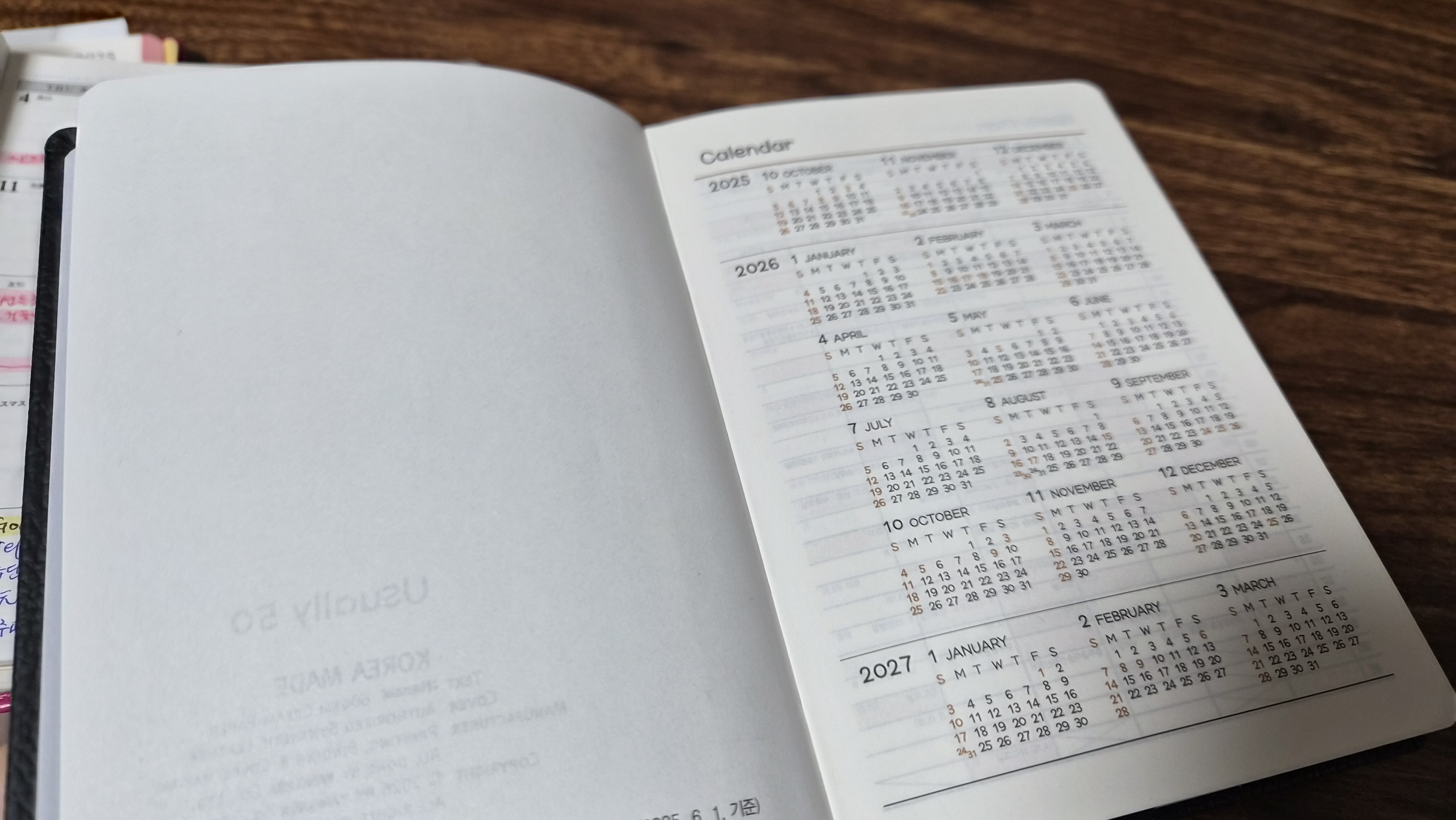 우선 가죽느낌의 매트한 커버가 너무 마음에 들었어요. 12월 캘린더가 있어 다음주부터 쓸수 있다는 점도 좋았구요. 일간페이지는 1월 1일부터 있어서 내년이 기다려져요. 양지다이어리 최고입니다~~