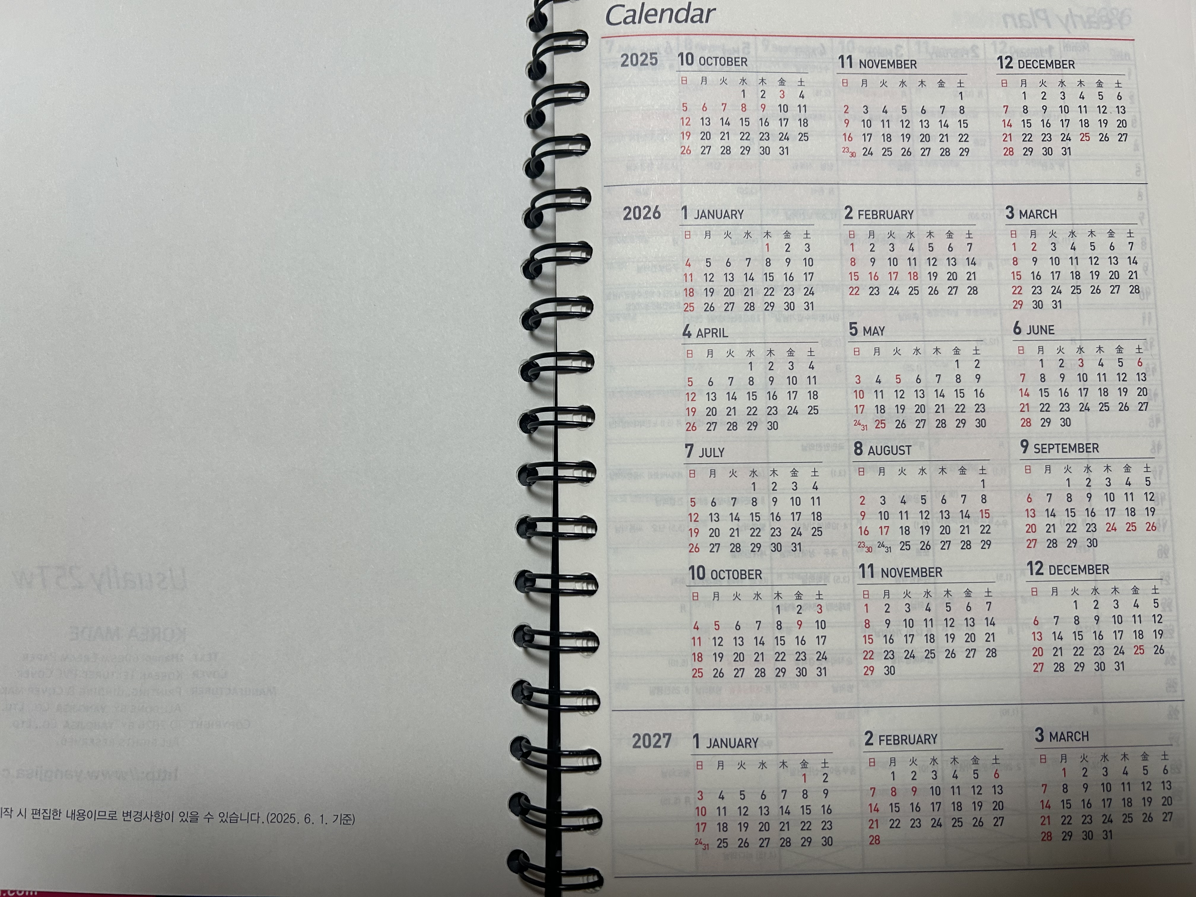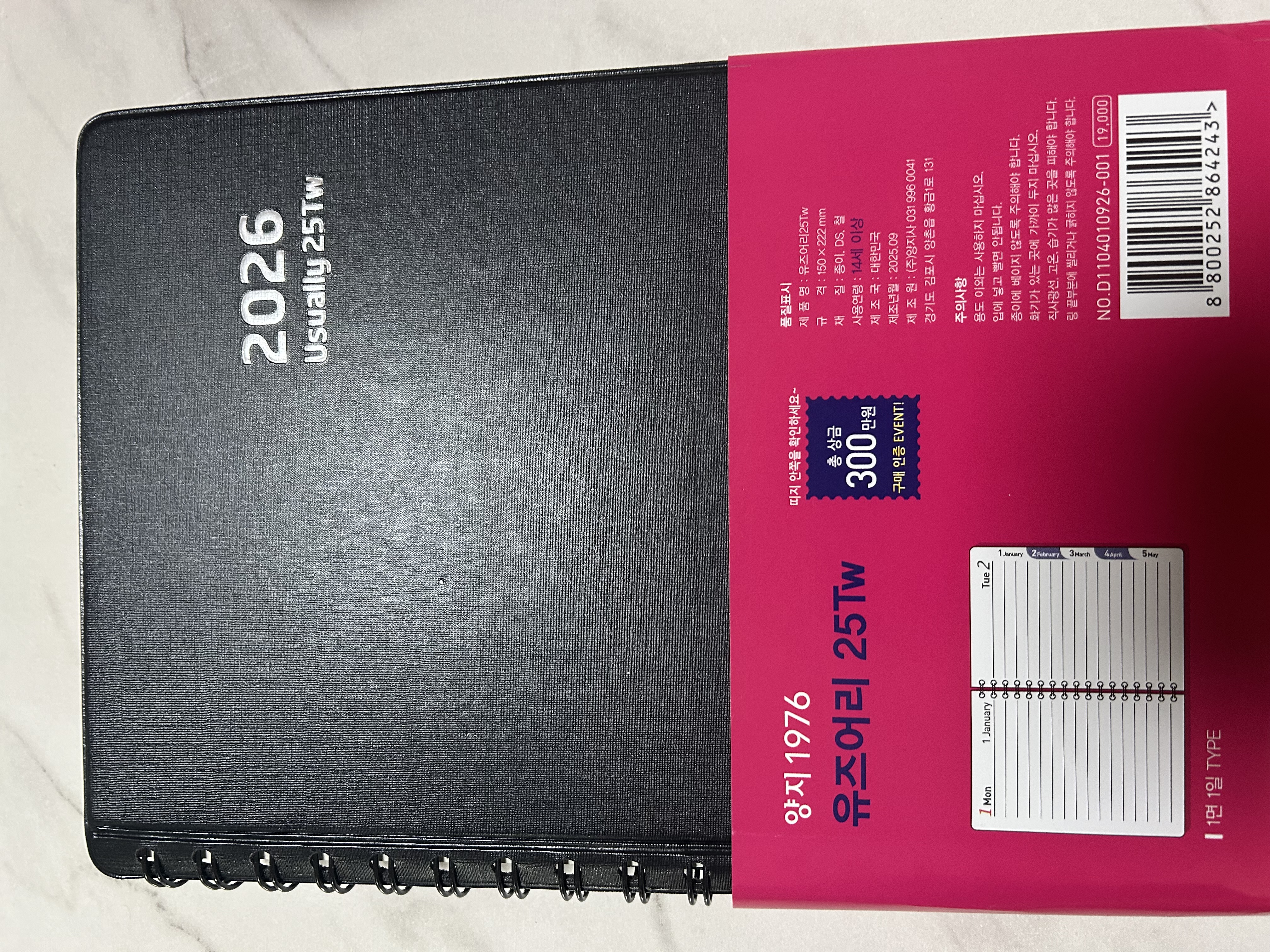 표지가 깔끔하고 튼튼해서 가방에 넣고 다녀도 쉽게 구겨지지 않아요. 스프링 제본이라 쫙 펼쳐져서 필기하기 편하고, 하루 한 페이지 구성이라 일정이 많은 날에도 충분히 적을 수 있어요. 종이 질도 좋아서 볼펜 사용 시 번짐이 거의 없고, 전체적인 레이아웃이 심플해서 오래 써도 질리지 않을 것 같아요. 연간·월간 캘린더도 한눈에 보기 좋게 정리되어 있어서 일정 관리용으로 딱입니다. 학생, 직장인 모두 무난하게 쓰기 좋은 다이어리라고 생각해요.