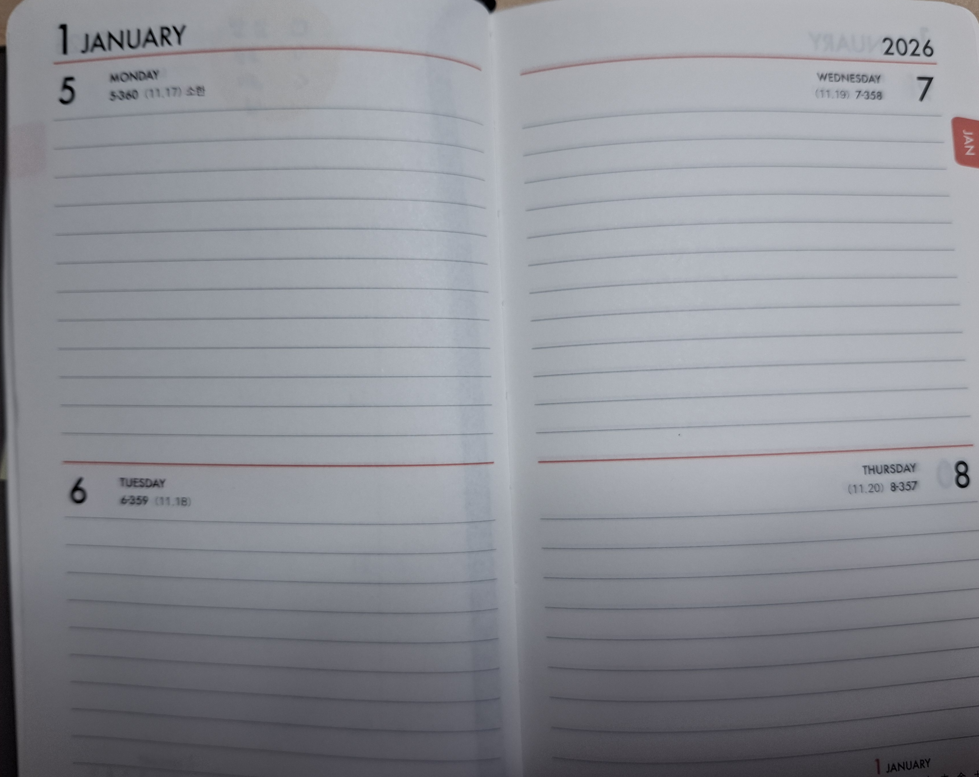한 손에 딱 들어오는 엘리트 32는 포괄적인 일정 관리를 하기에 매우 적합합니다! 앞부분은 매달의 일정을 간략하게 정리하는 용도로 활용 가능합니다. 뒷부분의 구성은 한 페이지 당 2일의 구성으로 되어 있는데, 날마다 할 일을 짧게 적어봄으로써 보다 효율적인 일정 관리가 가능합니다! 더불어서 우측 하단에는 작게 달력을 표시해서 일정 관리와 현재의 날짜를 파악하기 용이합니다. 뒷부분은 크게 thinking platform 과 2027 wish to do로 구성되어 있어 앞으로의 계획과 떠오르는 아이디어를 적어볼 때 사용 가능할 것 같습니다!