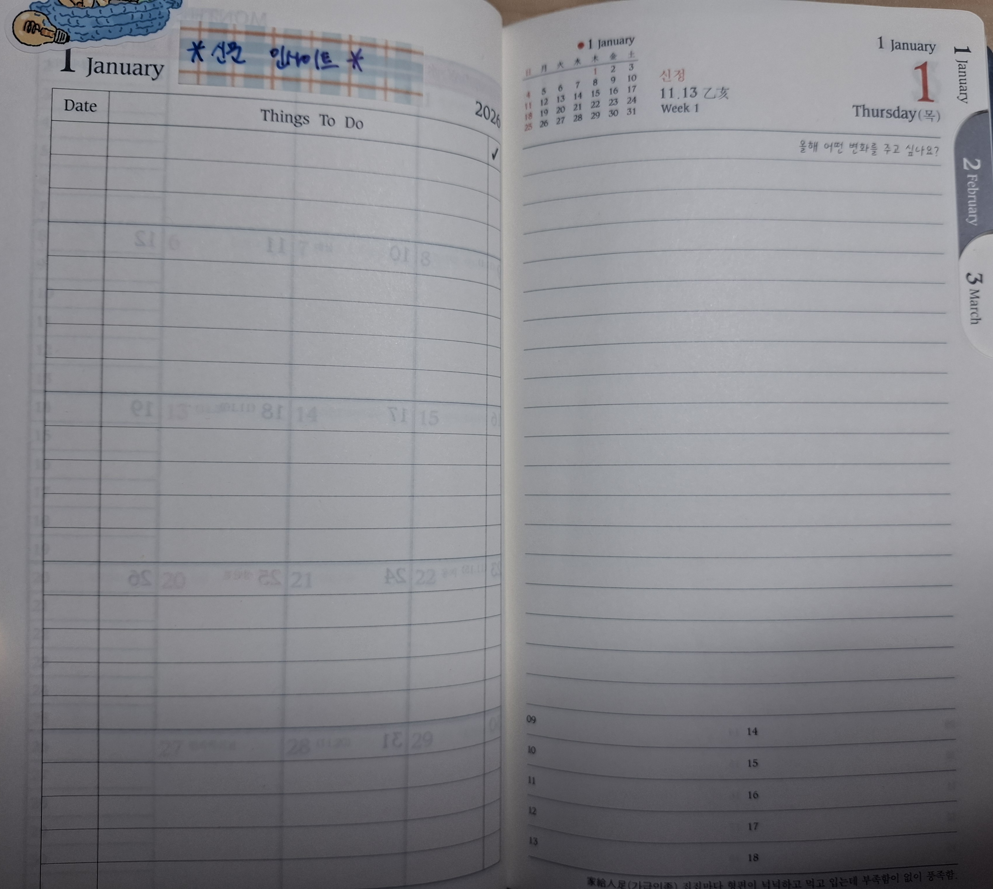 앞부분에 달력이 배치되어 있고, 좌측에 작게 활용 가능한 칸도 있습니다. 먼슬리가 지나면, 1일 1페이지로 구성되어 있습니다. 우측 상단에 달력을 작게 배치한 부분도 다이어리의 활용할 때 유용할 것 같습니다. 또 매달의 첫 시작 부분에 일자별로 things to do가 배치되어 매달 첫 시작을 계획할 때 혹은 매달이 끝나는 지점에서 회고할 때 잘 활용할 수 있을 것 같습니다. 뒷부분에 전화기록부가 있는데, 이번에는 이를 '독서기록'을 짧게 해보는 형태로 변형해서 사용할 계획입니다.