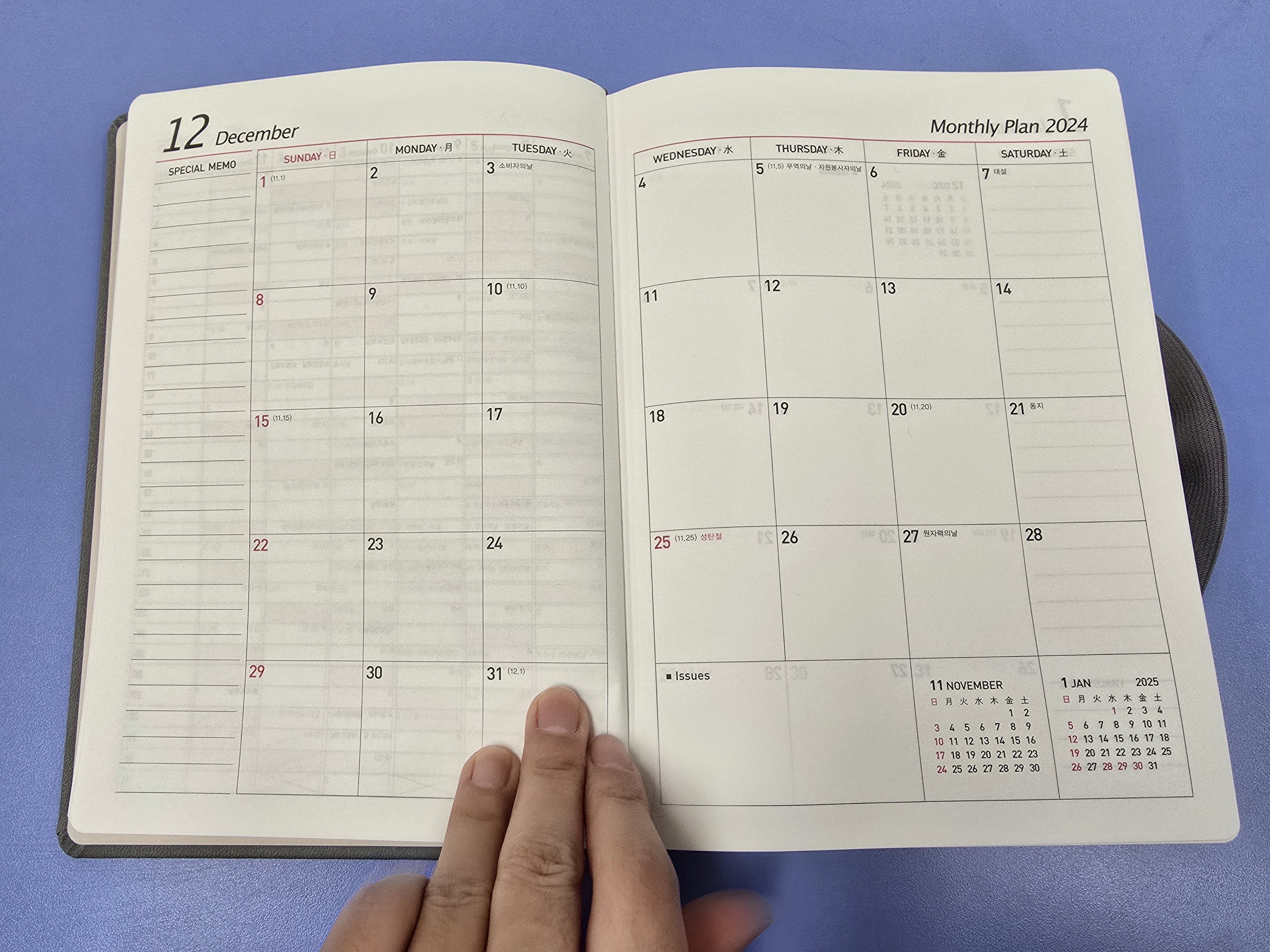 2025년 오프라인에서 다이어리 구매했는데 맘에듭니다. 일단 깔끔하고 얇아서 들고다니기 좋을거 같습니다. 업무용으로 쓸거라 토일은 작아서 더 좋아요. 꾸준히 쓰면서 업무하면 많이 도움이 될 것 같아요.