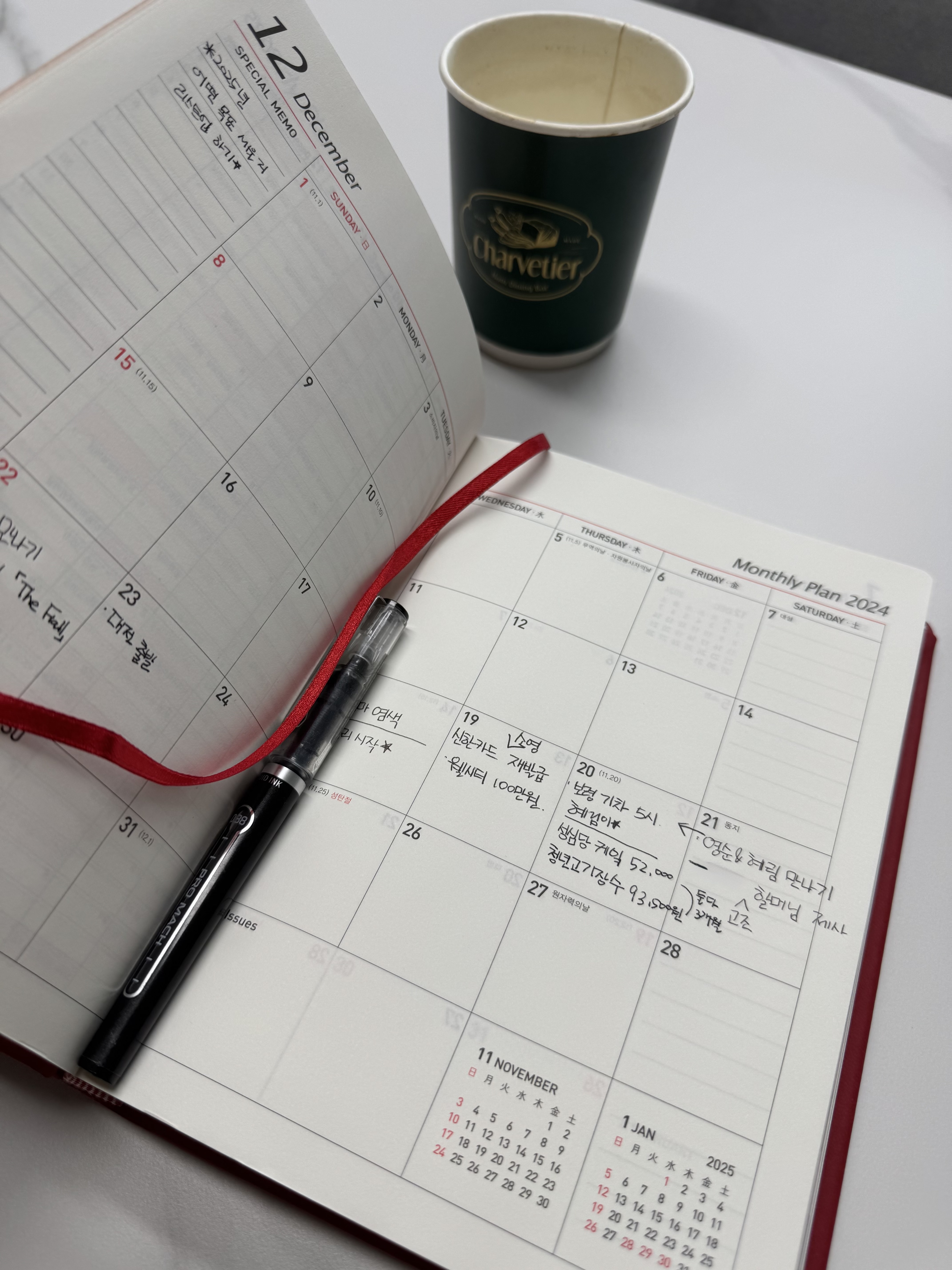 매일을 돌아보며 감사하는 것을 찾고 그것을 기록으로 남긴다면 스스로를 포기할 일은 없다,는 확신으로 일기를 쓴 지 17년 됐습니다. 매해 쓴 다이어리를 파기하는 것이 연말마다 꼭 치르는 행사였는데요, 2025년 다이어리부터는 간직하려 합니다. 책장 맨 아래칸에 40권짜리 저의 일대기를 써내려가 보겠습니다^^ 매일을 크리스마스처럼 보내고 싶어 레드를 선택했습니다. 성실하고 둥근 마음으로 2025년 화이팅!