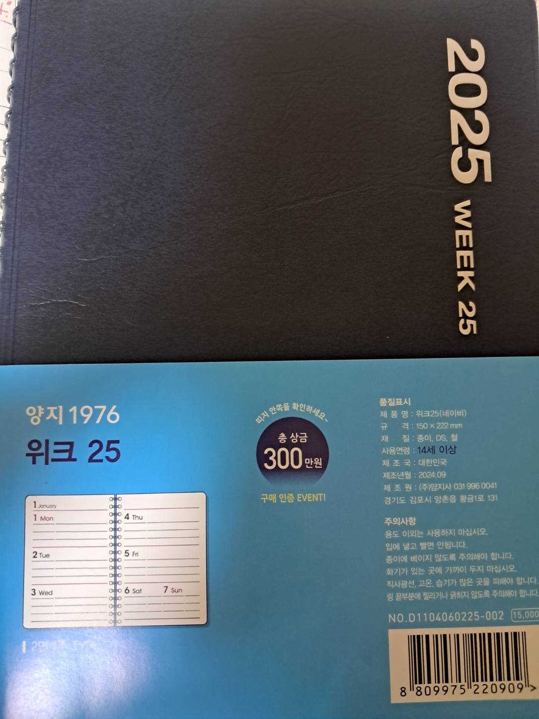 매년 연말이 되면 마음에 드는 양지사 다이어리를 하나 구입합니다. 매일매일 무엇을 해왔고, 반성할 것은 무엇인지를 하나하나 기록하기 위해서 입니다. 그런 기록들을 해온 지 5년 째인데, 올해는 2025 Week25를 구매했습니다. 간단하게 메모할 수 있는 공간과, 서술할 수 있는 가로줄 페이지가 따로 있어서 저에게 유용하게 사용될 것 같습니다. 잘 만든 다이어리. 잘 쓰고 있습니다. 감사합니다.